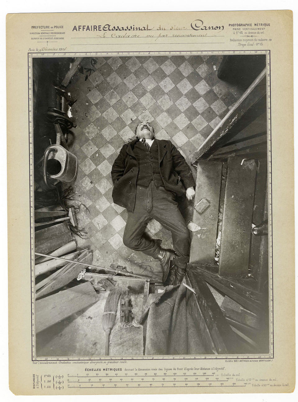 Alphonse Bertillon, Assassinat de monsieur Canon, boulevard de Clichy, le 9 décembre 1914 : vue par renversement / Préfecture de police de Paris, Service de l’Identité judiciaire. (Archives de la Préfecture de police de Paris) – Exposition « Images à Charge, la construction de la preuve par l’image », Le Bal